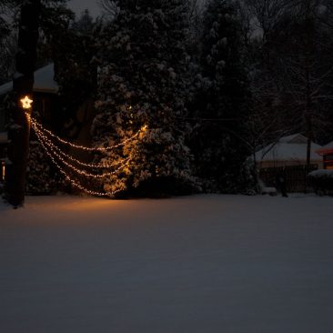Some fireflies across the street, summertime dusk.