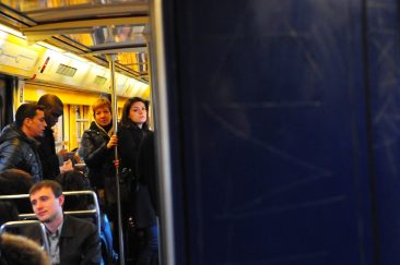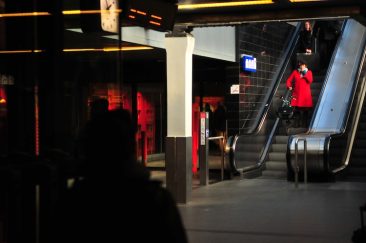 A woman in red descends an escalator at the central train station, Amsterdam.